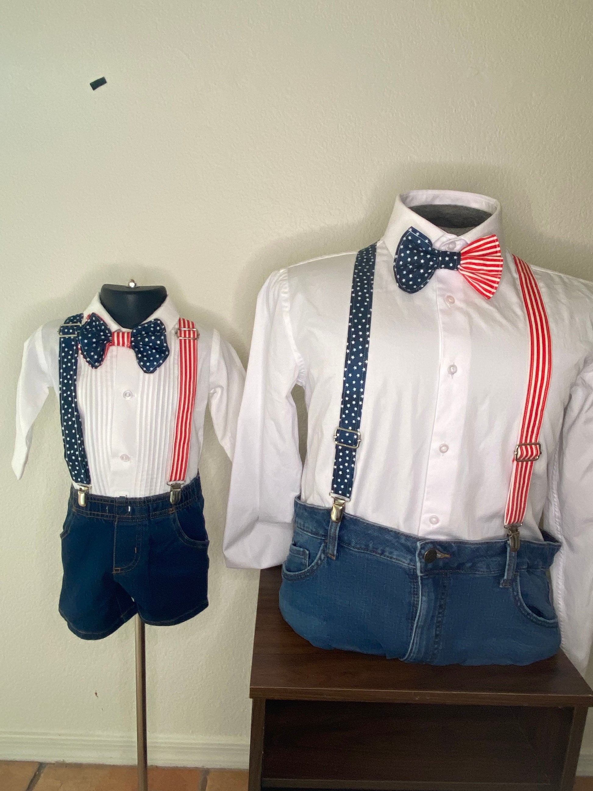 American flag bowtie and suspenders. Available in many sizes and variations. Customizable. fashionable way to show your patriotism!