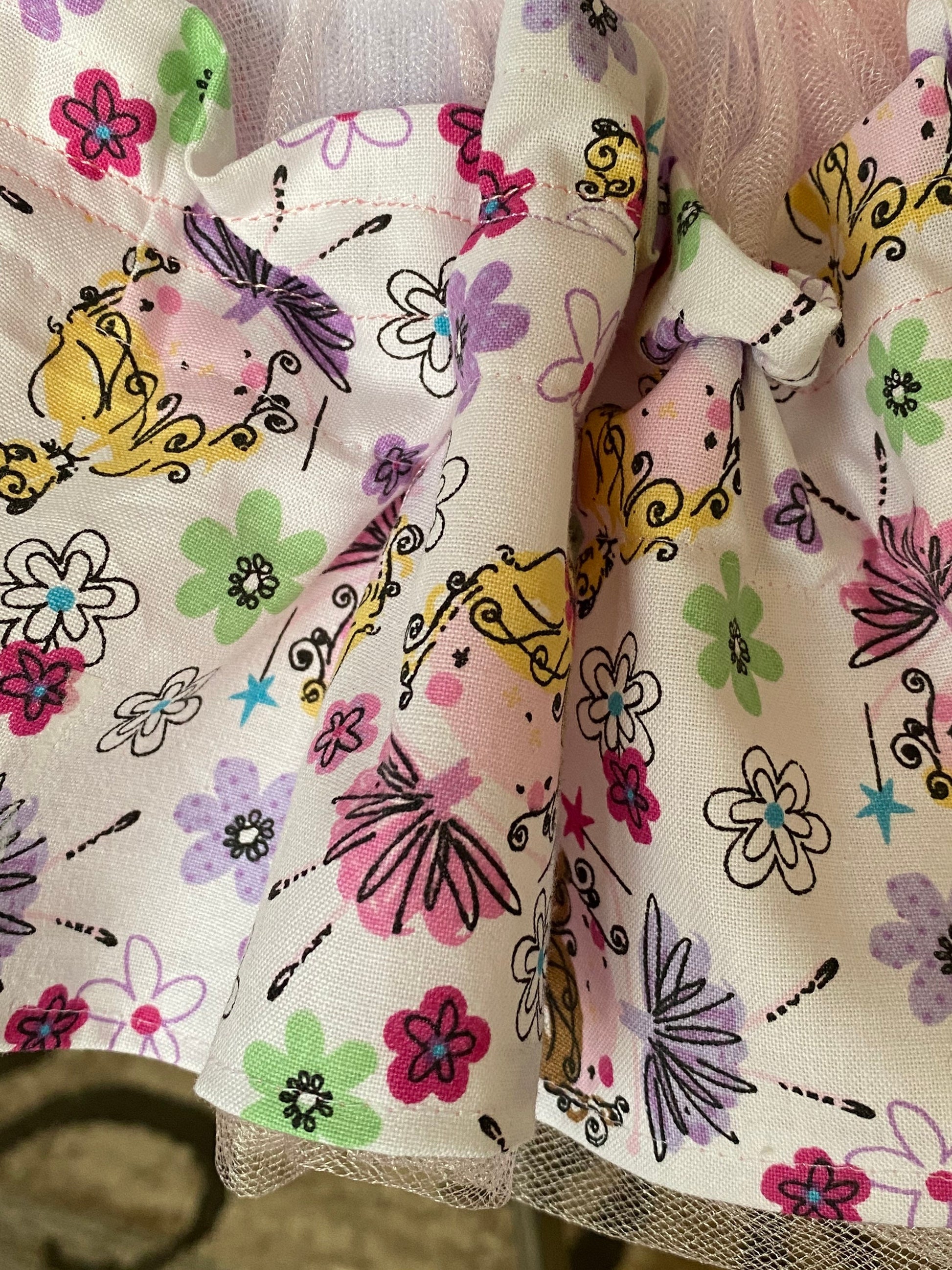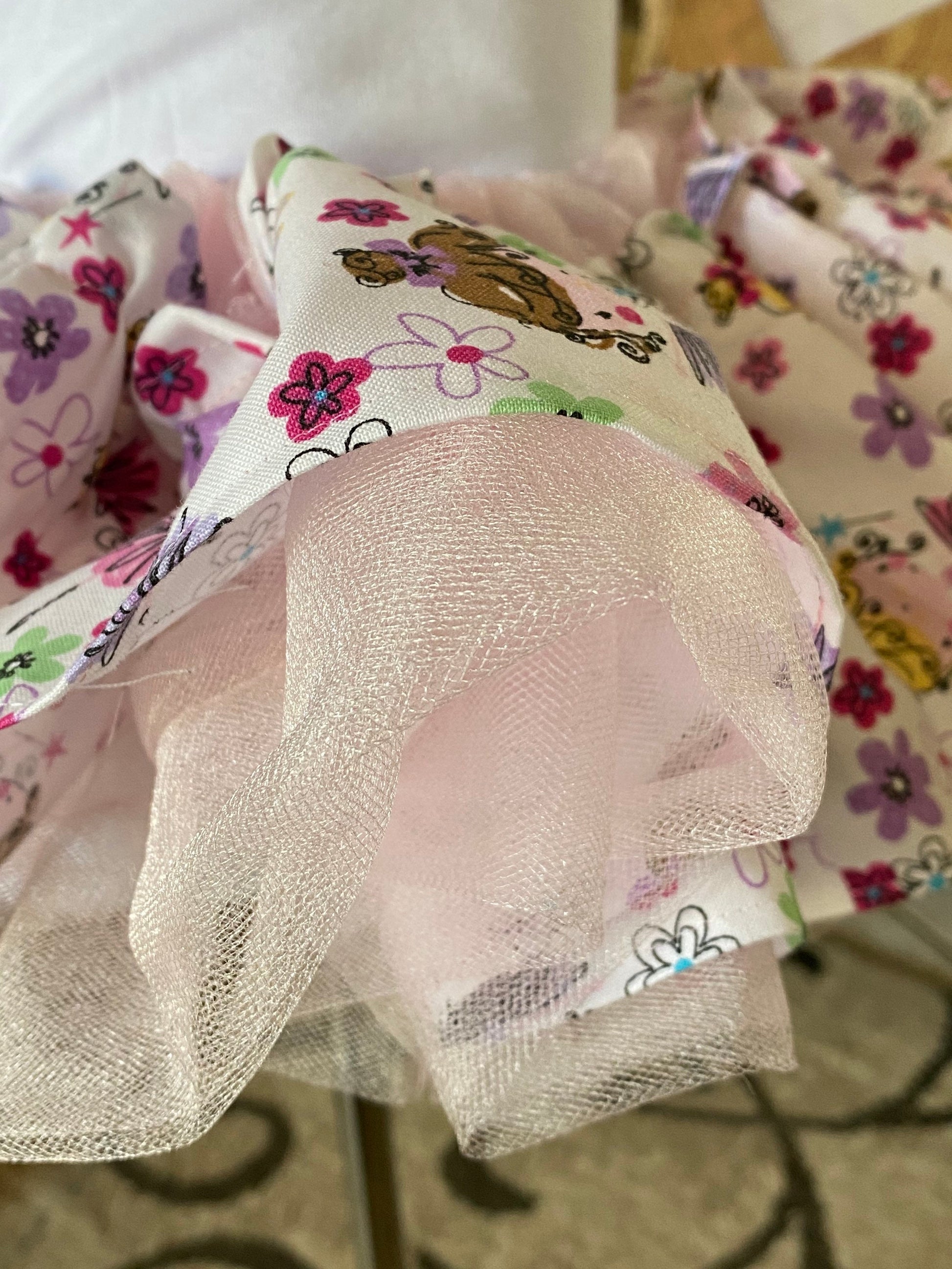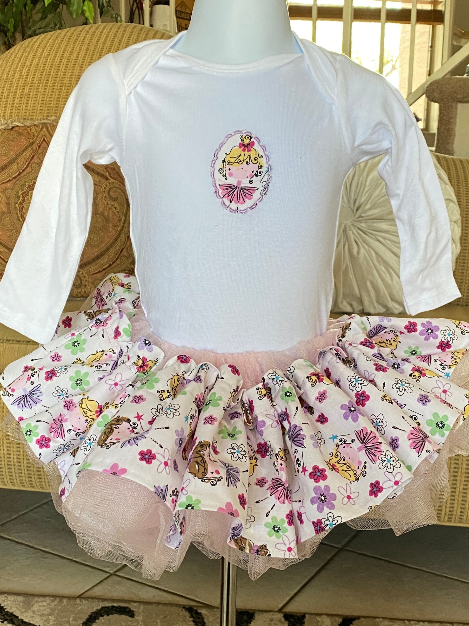 Tutu has elastic waist, so it will grow with your child and most likely will fit her for a few years! Soft rose pink tulle skirt with over lay of 100% cotton fabric. Several different ballerina dancers shown on the skirt fabric. Soft and comfortable.