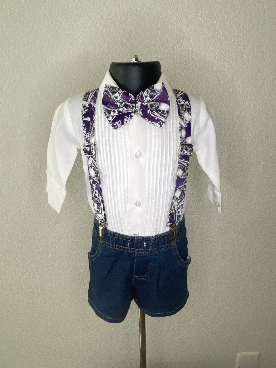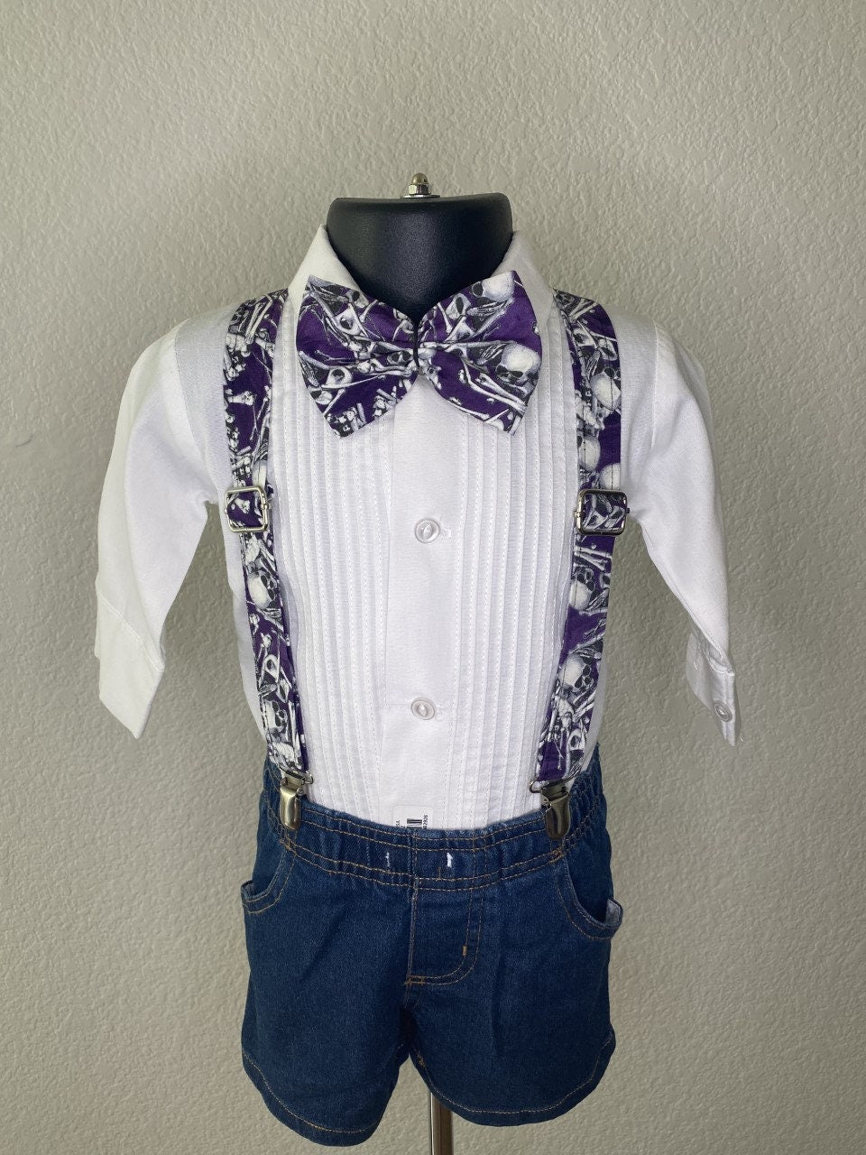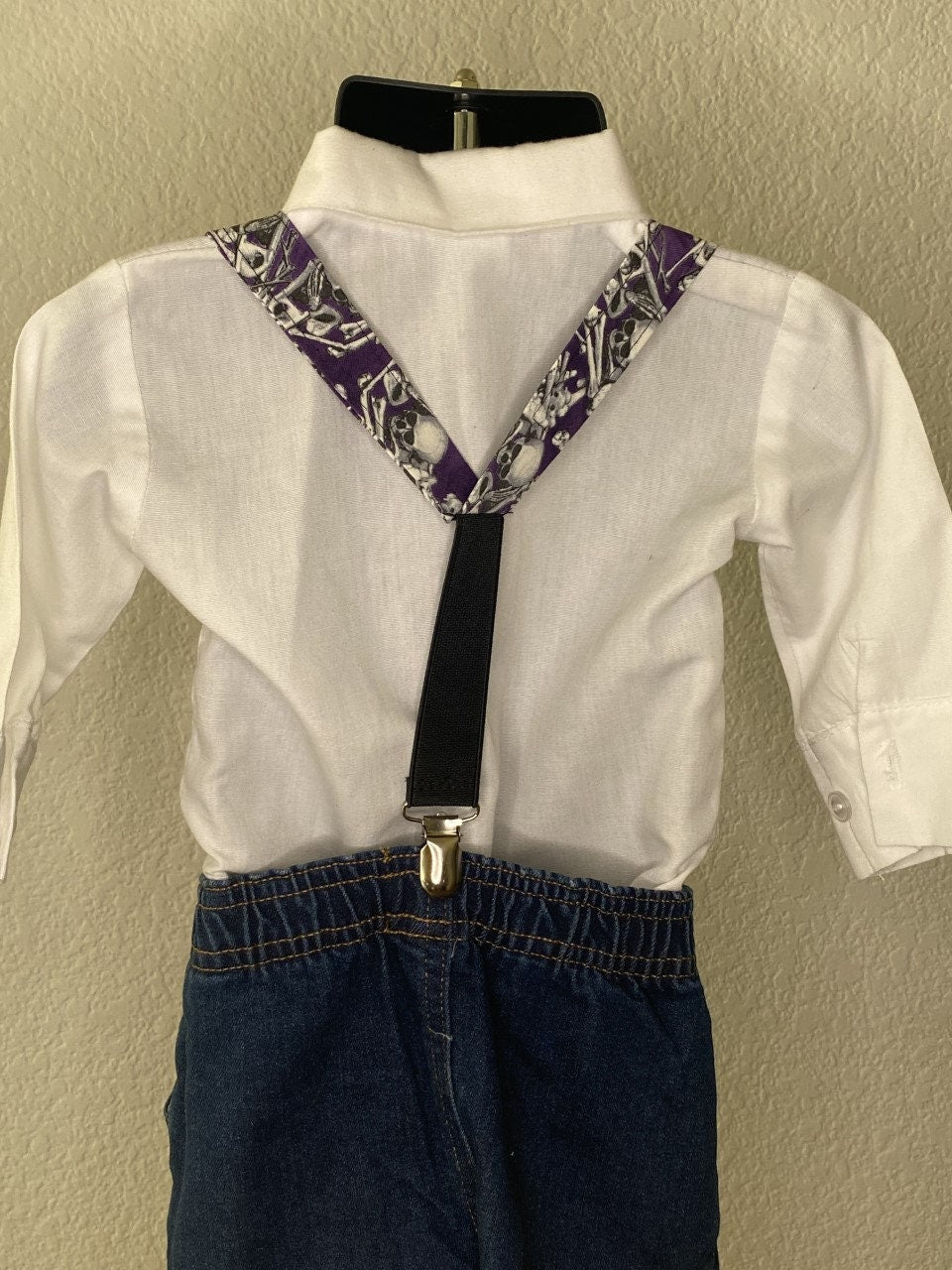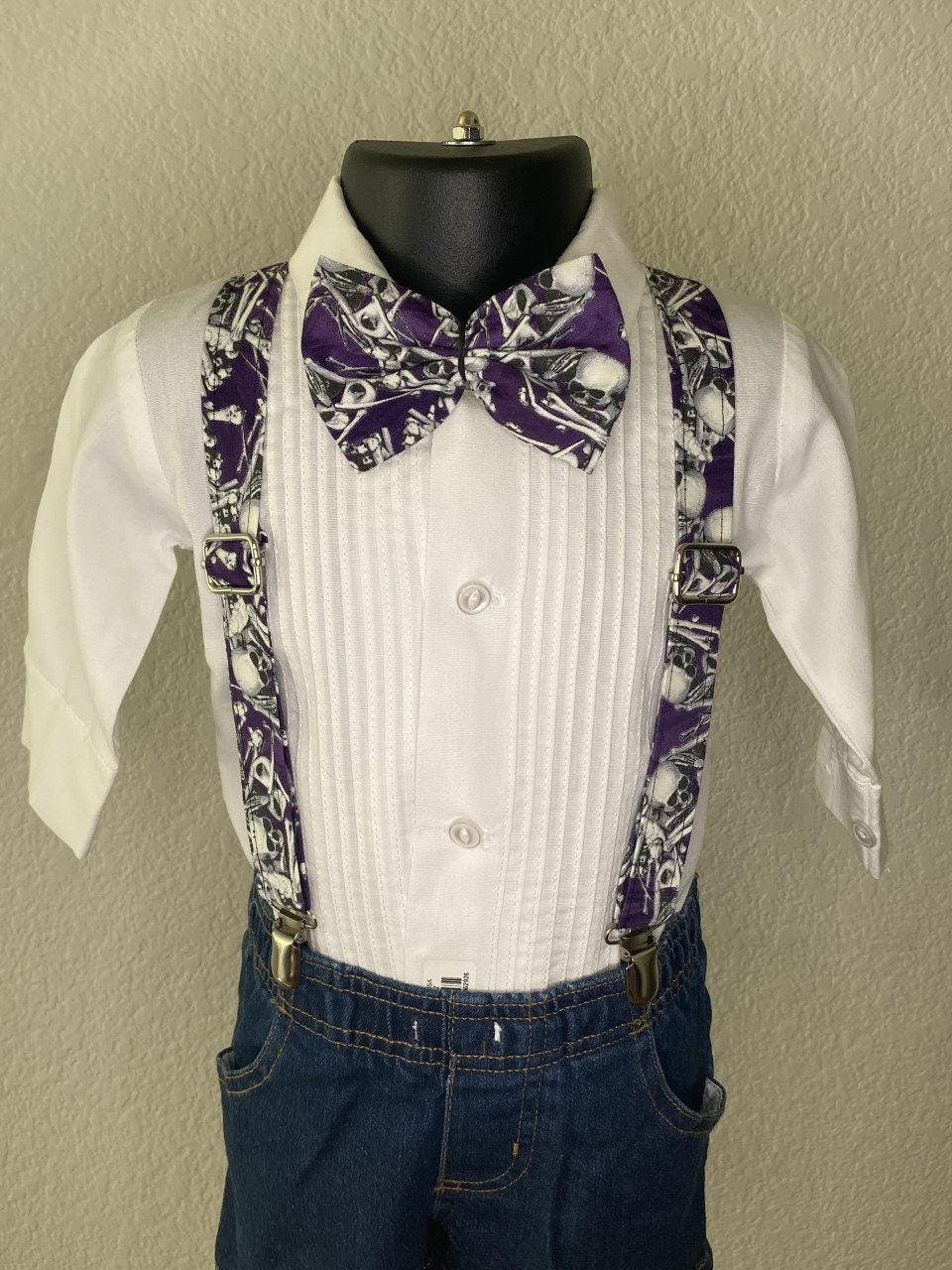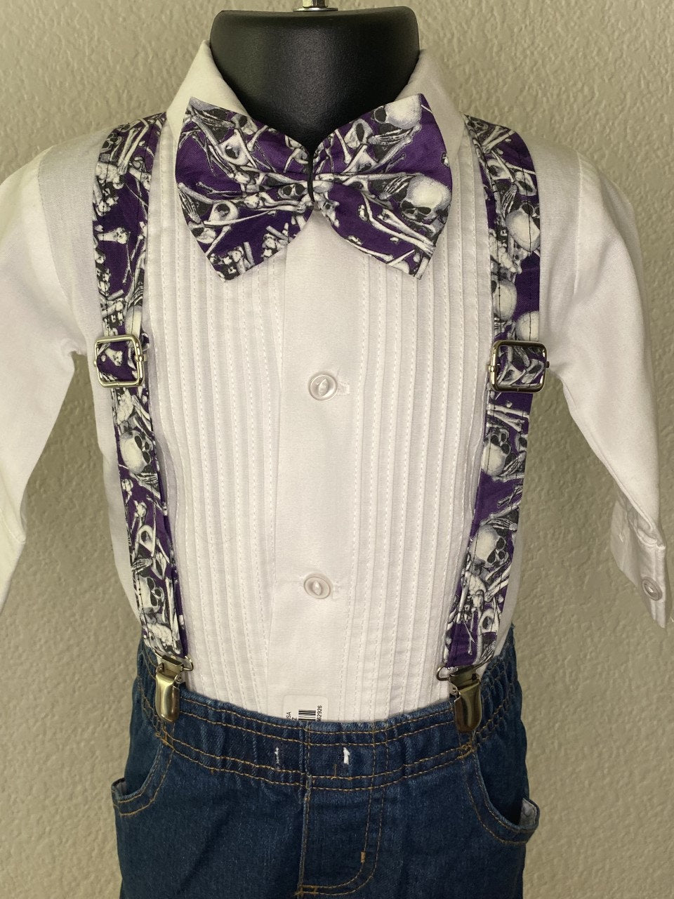 Halloween Skeleton Skull Purple suspenders and bow tie / Infant, Toddler, Child, Teen, Adult, Big & Tall